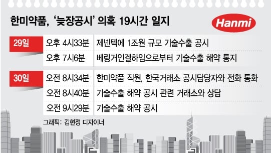 하지만 관련 내용을 거래소에 바로 알리지 않았다. 김재식 한미약품 부사장(CFO)는 "중요한 사항이기 때문에 (거래소) 야간 당직자에게 맡길 수 없다고 판단했다"고 설명했다. 한미약품은 그날 밤새 계약 해지 영향 등을 분석한 것으로 전해진다.
