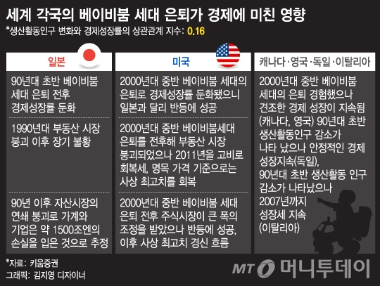 반면 키움증권은 베이비붐 세대의 은퇴가 반드시 장기불황을 초래하는 것은 아니라는 전제로 주식시장에 대해서도 다른 견해를 냈다. 일본과 달리 미국은 2000년대 중반 베이비붐 세대의 은퇴를 전후해 단기 불황을 거친 뒤 8년 호황을 맞았기 때문이다. 즉 고령화 이후 경기 상황은 국가마다 달랐다고 지적한다.