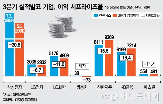 3분기 실적 시즌이 본격적으로 시작된 가운데 희비가 뚜렷하게 엇갈리고 있다. 갤럭시노트7 리콜 영향으로 잠정실적을 하향 조정한 삼성전자를 비롯해 LG화학, LG전자 등 대형주들이 컨센서스를 밑도는 부진한 실적을 발표했지만 KB금융, 신한지주 등 금융주들은 연이어 어닝 서프라이즈를 기록했다.