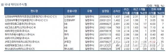 펀드별로는 신한BNPP해피라이프연금전환형[자]1(주식)(C-C1)가 2.48%로 수익률이 가장 좋았다. 신한BNPP좋은아침희망[자]1(주식)(C-C1), KB한국대표그룹주[자](주식)A, KB그로스포커스[자](주식)C-R, KB외국인선호주(주식)A도 2%대의 양호한 수익률을 보였다.