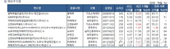 금 펀드와 브라질 펀드가 수익률 상위를 차지했다. 블랙록월드골드[자](주식-재간접)(H)(A)는 6.35%가 뛰었고 KB브라질[자](주식)A는 5.3%, 미래에셋브라질업종대표[자]1(주식)C-A는 5.11%, 신한BNPP골드1(주식)(C-A)는 4.95%가 올랐다.