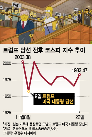 22일 코스피 지수는 17.42포인트(0.89%) 오른 1983.47에 마감하며 트럼프 미국 대통령 당선 이후 가장 큰 폭의 반등을 나타냈다. 연말 미국의 쇼핑 대목을 앞두고 삼성전자를 비롯한 IT(정보기술) 업종이 강한 상승세를 나타냈다.