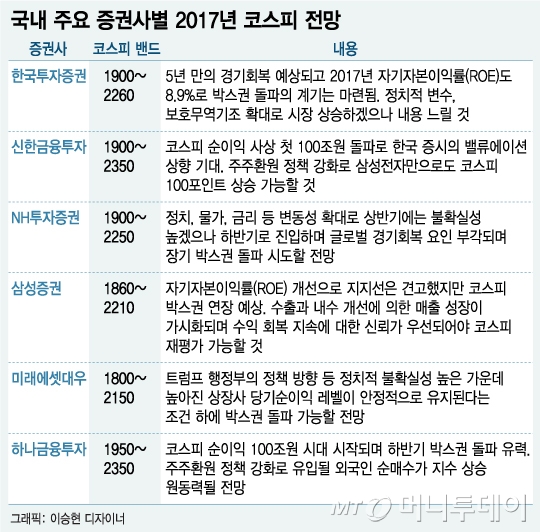 국내 주요 6개 증권사의 투자전략팀장들은 2017년 코스피의 복병으로 △대통령 선거 등 정치적 불확실성 △트럼프 행정부의 정책 방향성 △불안한 한국 경제를 꼽았다. 반면 순이익 증가추세와 주주환원 정책 확대가 코스피 박스권 돌파의 견인차가 될 것으로 내다봤다.