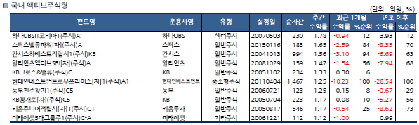 운용펀드 기준으로 순자산 100억원 이상인 펀드 중에서는 하나UBSIT코리아1(주식)A의 주간 성과가 1.78%로 가장 높았다. 그 뒤를 스팍스밸류파워[자](주식)A(1.65%), 칸서스하베스트적립식1(주식)K5(1.56%), 알리안츠액티브SRI[자](주식)A(1.47%), KB그로스&밸류(주식)C(1.33%)가 차지하는 등 대부분 100억~200억원대 규모의 펀드가 선전했다.