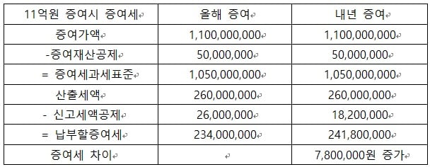 예를 들어 부모가 자녀에게 11억원의 재산을 증여한 경우 올해 납부할 증여세와 내년에 증여할 경우를 비교하면 아래와 같다. 내년 1월1일부터 적용될 신고세액 공제율의 축소로 인해 올해 증여하는 것이 세부담 측면에서 유리하다.
