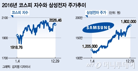 지난 1월18일 108만8000원까지 내렸던 삼성전자는 12월21일 장중 183만원의 역대 최고가를 기록했고, 이제 200만원 돌파를 목전에 뒀다. 2016년 마지막 거래일 삼성전자는 1만4000원(0.78%) 오른 180만2000원에 마감했다. 연초대비 주가상승률은 43.0%를 기록했으며 시가총액은 68조원 불어난 253조5041억원을 기록했다. 코스피 시가총액 비중은 15%에서 19%(우선주 포함시 21%)로 증가했다.