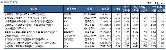 해외 주식형 펀드는 한 주간 평균 0.01%의 수익률을 기록했다. 국가별로는 브라질(0.86%), 중국(0.36%), 인도(0.02%) 펀드가 양호했지만 러시아(-0.76%), 일본(-0.69%), 미국(-0.20%) 펀드는 부진했다.