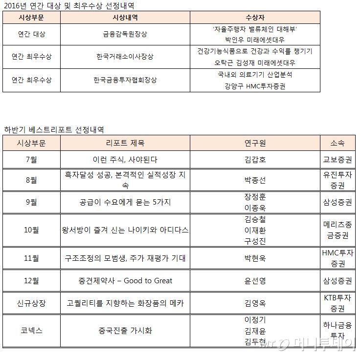 이번 시상식에서는 지난해 하반기 월별 베스트리포트와 신규상장, 코넥스 부문 베스트리포트도 함께 시상됩니다. 투자자 여러분들의 관심과 성원을 부탁드립니다.