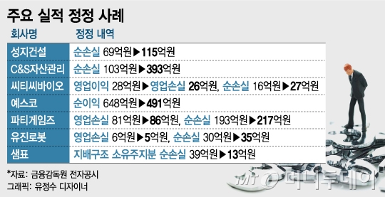 씨티씨바이오(4,160원 ▲115 +2.84%)도 지난해 흑자(영업이익 28억원)를 냈다고 했으나 감사 후에는 26억원 영업손실에 27억원 순손실로 정정했다.예스코(16,110원 ▲110 +0.69%)의 순이익 648억원도 회계감사 후에는 491억원으로 내려갔다.