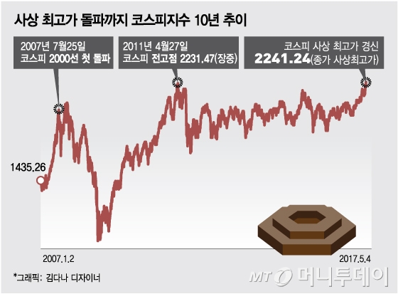 4일 코스피 지수는 전일대비 21.57포인트(0.97%) 오른 2241.24에 마감했다. 장 마감 동시호가에 2240선을 돌파하며 종가가 곧 사상 최고가로, 2011년 4월27일 기록한 전고점(2231.47)을 경신하며 장을 종료했다.