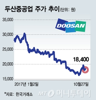 #1.한국수력원자력이 신고리 원자력 발전소 5·6호기 건설공사 중단을 결정한 지난 7월14일. 시공사 두산중공업 주가는 5% 가까이 밀렸다. 1조원 넘게 남은 공사대금을 받지 못하게 될 것이란 우려에서다. 정부의 원전 재개 여부 공론화와 함께 내리막을 걷기 시작한 주가는 결국 2만원선을 내주고 1만6000원대까지 하락했다.