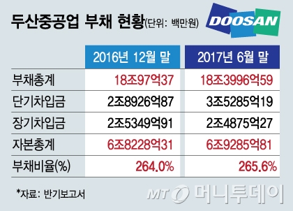 두산그룹 종목의 고질병인 부채비율 역시 투자자들의 눈길을 거두는 요소다. 올해 반기보고서 기준 두산중공업 부채 총계는 18조3997억원으로 부채비율(부채총계/자본총계)은 265.6%다. 지난해 말(264%) 대비 1.6%p(포인트) 증가했다.