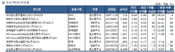 중국 펀드가 수익률 상위를 주로 차지했다. 신한BNPP중국본토중소형주RQFII[자]1(H)(주식)C-A1(2.73%), KB중국본토A주레버리지[자](주식-파생재간접)A(2.64%), 삼성중국본토레버리지[자]1(주식-파생재간접)-A(2.39%), 삼성중국본토중소형FOCUS[자]H(주식)-A(2.30%) 등의 수익률이 우수했다.