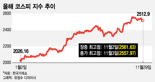28일(현지시간) 뉴욕 증시는 북한의 미사일 시험발사에도 세제법안 훈풍에 힘입어 3대 지수가 일제히 종가기준 사상 최고가를 갈아치웠다. 29일 코스피 증시는 전날대비 1.29포인트(0.05%) 내린 2512.90 마감했다. 지난 2일 장중 2561.63으로 사상 최고점을 경신한 이후 소폭 내림세다.