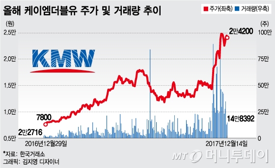 금융감독원 전자공시에 따르면 케이엠더블유는 2014년부터 지난해까지 3개년 연속 영업손실을 기록했다. 올 9월까지 연결 매출은 1671억원, 영업이익은 67억원 수준이다.