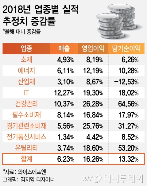 산업재에 포함되는 조선 업종, IT에 속한 디스플레이 업종을 제외하면 모두 올해보다 매출액과 영업이익이 성장할 것으로 예상된다.