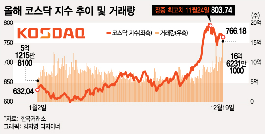 코스닥이 11월 말 고점을 찍은 이후 조정세를 이어가고 있다. 연말까지는 수급 불균형에 따라 지수 하락세가 지속될 수 있지만 내년 초 '1월 효과'로 반등할 것이란 분석이 힘을 받고 있다.