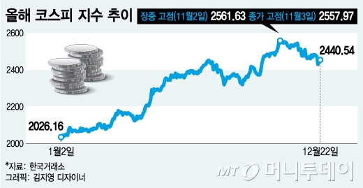 그러나 코스피는 지난달 2일 장중 고점(2561.63) 대비로는 5% 가까이 떨어졌다. 이때부터 약 두달간 외국인은 2조462억원어치를, 개인은 2조7396억원어치를 팔아치웠다.