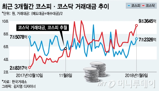 코스닥 시장에 대한 투자자들의 관심은 거래대금 급증에서 확인할 수 있다. 지난해 11월부터 코스닥 거래대금은 코스피를 넘어섰다. 지난달 21일 코스닥 거래대금은 10조323억원으로 1996년 코스닥 출범 이후 사상 처음 10조원을 넘겼다.