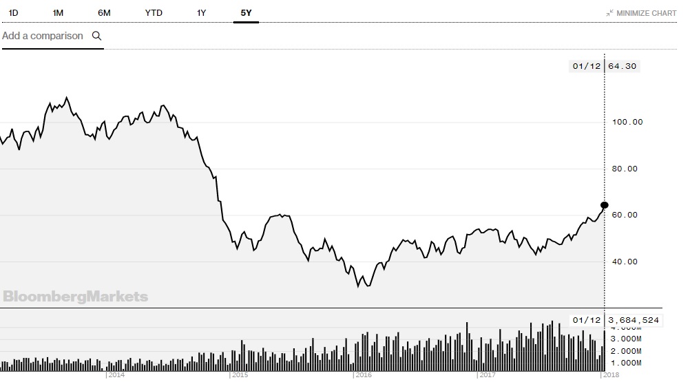 12일(현지시간) 뉴욕상업거래소에서 2월 인도분 WTI는 전일대비 배럴당 50센트(0.8%) 오른 64.30달러로 거래를 마쳤다. 주간으로는 4.7% 올랐다. 미국의 원유재고량 감소에 힘입어 5거래일 연속 상승하며 3년래 최고가를 기록한 것이다.