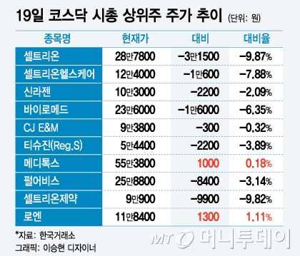 개별 종목으로도 바이오 대장주인셀트리온(200,500원 ▼1,000 -0.5%)이 전날대비 3만1500원(9.87%) 하락한 28만7800원에 마감했다. 외국인이 1022억원어치를 내다팔면서 셀트리온은 7거래일 만에 다시 30만원을 밑돌았다.셀트리온헬스케어와셀트리온제약(56,300원 ▲600 +1.08%)은 전날대비 각각 7.88%, 9.82% 하락했다.