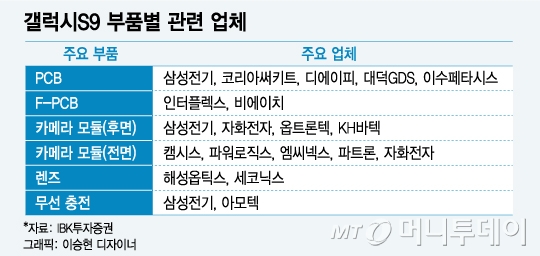 갤럭시S9 부품 가운데 카메라 모듈은삼성전기(567,000원 ▲51,000 +9.88%)와자화전자(34,900원 ▲350 +1.01%),세코닉스(5,230원 ▲150 +2.95%)등이 납품한다. 전면 카메라는캠시스(1,732원 ▲162 +10.32%)와파워로직스(4,740원 ▲50 +1.07%), 엠씨넥스, 파트론 등이 무선 충전기는 삼성전기와아모텍(17,670원 ▲1,460 +9.01%)이 주로 공급할 예정이다.