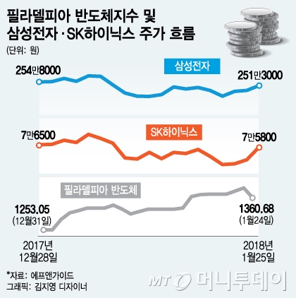 필라델피아 반도체지수는 올 들어 8.6% 상승했다. 필라델피아 반도체지수는 미국 증시서 대표적인 반도체주 16개를 포함하고 있어 반도체 주식의 투자 지표로 주로 사용된다. 이 지수는 삼성전자와 상관계수가 높아 삼성전자 주가 전망에도 참고되는 지표다.