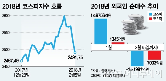 5일 코스피지수는 전 거래일보다 33.64포인트(1.33%) 내린 2491.75에 마감했다. 지난달 15일 이후 3주만에 종가기준 2500선이 깨졌다. 코스닥지수는 전 거래일보다 41.25포인트(4.59%) 내린 858.22 거래를 마쳤다. 퍼센트 기준으로는 브렉시트가 결정된 2016년 6월24일(-4.76%) 이후 최대 하락률을 기록했다.