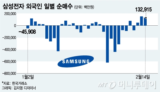 14일 코스피시장에서삼성전자(208,000원 ▲4,000 +1.96%)는 전날보다 7만3000원(3.07%) 오른 245만원에 거래를 마쳤다. 삼성전자 부활에 힘입어 설연휴를 앞둔 코스피 지수도 26.64포인트(1.11%) 오른 2421.83에 마감했다. 이날 코스피시장에서 외국인은 1093억원을 순매수했는데 전기·전자업종에서는 1414억원을 사들였다.