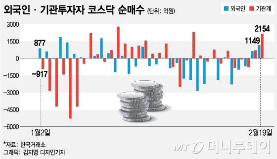 기관과 외국인이 하루동안 3300억원 넘게 동반 순매수한건 지난해 12월26일 이후 처음이다. 기관은 지난 1일 이후 오랜만에 코스닥시장에서 2000억원 넘게 순매수했다. 이날 기관이 가장 많이 사들인 종목은 KODEX 코스닥150레버리지 ETF로 순매수금액 342억원을 기록했다.