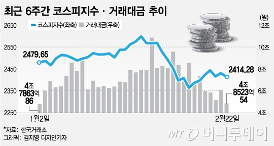 22일 코스피지수는 전날보다 15.37포인트(0.63%) 내린 2414.28에 마감했다. 5거래일째 1% 내외 등락을 지속하며 2400대를 지지했다. 이날삼성전자(204,000원 ▼6,500 -3.09%),SK하이닉스(998,000원 ▼35,000 -3.39%)는 각각 1.10%, 1.30% 하락했다. 셀트리온은 보합 마감했고 현대차, POSCO도 1.88%, 1.24% 떨어졌다.