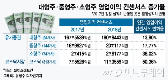 코스피 대형주 94개사의 연간 영업이익 컨센서스 증가률은 13.9%에 그쳤다. 이에 비해 중형주(144개사)는 17.8%, 소형주(74개사)는 38.0%로 집계됐다. 올해 예상 영업이익 증가율은 코스닥이 가장 높았고 코스피 소형주, 중형주, 대형주 순으로 나타났다.