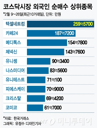 외국인은 최근 10거래일 동안 코스닥시장에서 3737억원을 내다팔았다. 장바구니에서 코스닥을 덜어내는 동안에도 선별적으로 종목을 담았는데 같은 기간 외국인 순매수 상위 종목 1위는텍셀네트컴이 차지했다.