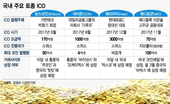 가상통화공개(ICO)가 전 세계 기업들의 새로운 자금조달 방법으로 떠오르면서 '토종코인'으로 불리는 보스코인(Boscoin), 아이콘(ICON), 에이치닥(Hdac), 메디토큰(MED) 등 국내 기업들도 수백억원에서 수천억원의 자금 유치에 성공했다. 다만 현 제도상 국내에선 ICO가 사실상 금지돼 있어 외부에 알리지 않는 등 여전히 몸을 사리는 모양새다.