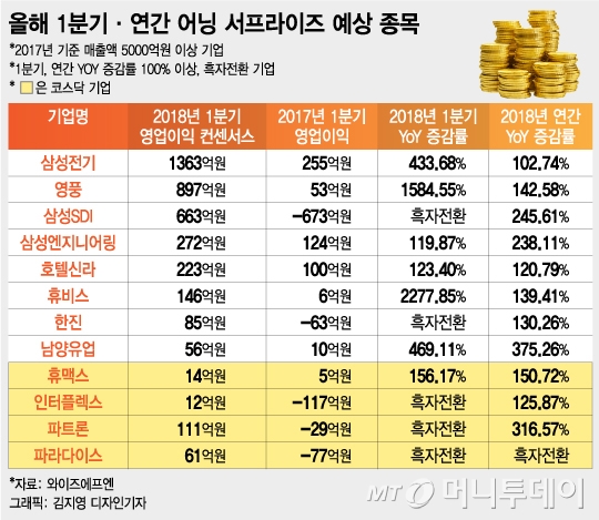 코스피에서는삼성전기(516,000원 ▲2,000 +0.39%)와영풍(59,200원 ▼1,600 -2.63%)삼성SDI(480,000원 ▲8,500 +1.8%)삼성엔지니어링(51,300원 ▲800 +1.58%)호텔신라(48,950원 ▲1,350 +2.84%)휴비스(3,155원 ▼115 -3.52%)한진(19,000원 ▼140 -0.73%)남양유업(52,200원 ▲1,500 +2.96%)이 꼽혔다. 코스닥 중에선휴맥스(721원 0%)와인터플렉스(12,110원 ▼30 -0.25%)파트론(7,820원 ▼270 -3.34%)파라다이스(14,820원 ▼30 -0.2%)가 1분기 턴어라운드 종목으로 예상된다.