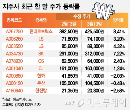 뒤이어SK(339,500원 ▼2,500 -0.73%)(7.22%)LG(90,600원 ▼1,200 -1.31%)(4.32%)LS(280,000원 ▼7,000 -2.44%)(3.20%)GS(69,400원 ▲800 +1.17%)(2.40%)CJ(201,000원 ▲5,400 +2.76%)(1.24%) 순으로 나타났다. 반면한진칼(110,700원 ▼4,000 -3.49%)(-2.58%)한화(121,200원 ▼2,600 -2.1%)(-2.03%)두산(1,295,000원 ▲91,000 +7.56%)(-0.48%)은 주가가 지난달 대비 소폭 하락했다. 같은 기간 코스피 상승률은 3.46%로 집계됐다.