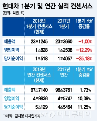 한편 금융정보업체 와이즈에프엔에 따르면 현대차의 1분기 매출 컨센서스는 23조1245억원으로 지난해 1분기 대비 1% 하락할 것으로 추정된다. 같은 기간 영업이익은 12.29% 하락한 1조828억원으로 예상했다.