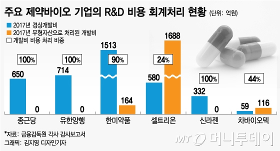 ◇들쭉날쭉 바이오株 R&D 비용 회계처리=제약바이오 기업의 연구개발비 회계처리 방식은 업체마다 다르다. 종근당, 유한양행 같은 전통적 제약업체는 일반 제조업체처럼 연구개발비를 100% 비용 처리하고 있다.