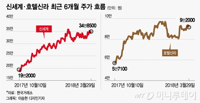 29일 증시에서신세계(346,500원 ▲16,500 +5%)는 1.46%(5000원) 오른 34만8500원에 마감했다. 올해 초 보다 16.2% 상승했다. 코스피 조정이 이어졌던 2월 이후에도 큰 하락 없이 견조한 주가 흐름을 이어왔다. 이밖에 연초 이후호텔신라(48,950원 ▲1,350 +2.84%)는 8.4%,한화갤러리아타임월드는 16.9% 주가가 올랐다.