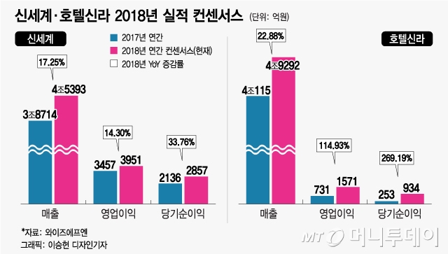 호텔신라도 연간 순이익이 지난해보다 두 배 이상 늘어날 것으로 기대된다. 호텔신라의 올해 순이익 컨센서스는 지난해보다 269.19% 증가한 934억원으로 예상된다. 같은 기간 영업이익은 114.93% 늘어난 1571억원, 매출은 22.88% 증가한 4조9292억원으로 전망된다.