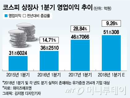 ◇'어닝시즌' 돌입… 2분기 주목할 종목은?=1분기가 마무리되면서 시장 관심은 상장기업 실적으로 옮겨갔다. 금융정보업체 와이즈에프엔이 최근 3년간 분기 실적이 집계되는 코스피 254개 기업을 대상으로 조사한 결과 1분기 코스피 상장사 영업이익을 51조308억원으로 추정했다. 지난해 1분기 대비 9.26% 늘어난 수치다.