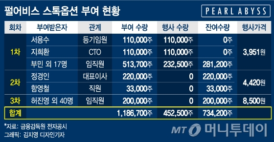 신라젠 뿐만 아니라 신규 상장된 바이오와 게임업체를 중심으로 스톡옵션 대박사례가 나오고 있다. 게임회사펄어비스(53,600원 ▲2,400 +4.69%)는 상장 전 세 차례에 걸쳐 △등기임원 3명 △비등기임원 2명 △직원 58명에 총 118만6700주의 스톡옵션을 부여했다. 이 중 45만2500주가 지난 2일 행사됐다. 등기임원인 서용수 디자인총괄 이사, 지희환 최고기술책임자(CTO)는 각각 274억원대의 평가수익을 올렸다.