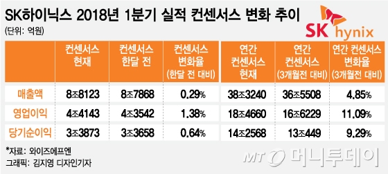 와이즈에프엔이 집계한 SK하이닉스 1분기 영업이익 컨센서스는 4조4143억원으로 한 달 전(4조3542억원)에 비해 1.38% 올라왔다. 연간 영업익 추정치는 18조4660억원으로 36229억원) 보다 11.1%나 늘었다.