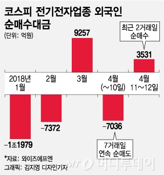 외국인은 4월2일부터 7거래일 연속 전기전자업종을 순매도하면서 7000억원이 넘는 자금을 빼냈다. 그러다 11일 733억원을 순매수하며 '사자'로 돌아섰다.