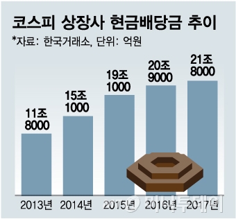 물론 기업의 배당이 늘긴 했다. 최근 5년간 코스피 현금배당(결산기준)은 △2013년 11조8000억 △2014년 15조1000억원 △2015년 19조1000억원 △2016년 20조9000억원 △2017년 21조8000억원 등으로 연평균 2조원씩 늘었다. 여기에는 삼성전자(2013년 2조1569억→2017년 5조8263억원)가 큰 몫을 했다.