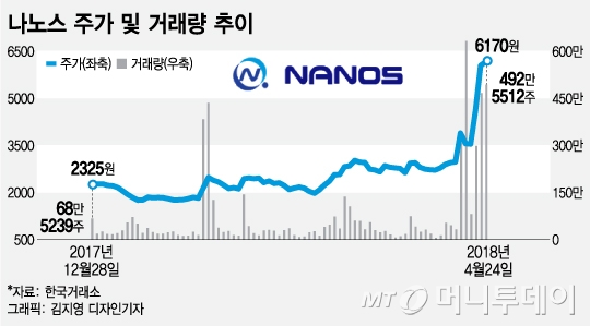 최근 주가 급등으로 이날 '투자주의' 꼬리표까지 더했다. 23일 종가가 5일 전 종가보다 60% 이상 상승했고, 15일 전 종가보다 100%이상 상승해서다. 거래소는 5월9일까지 나노스 주가 흐름을 판단해 단기급등이 지속될 경우 투자경고종목으로 지정할 예정이다.
