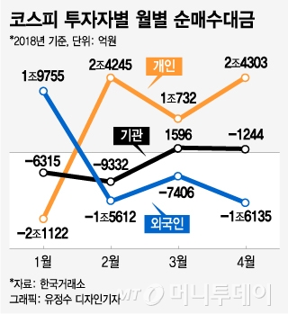외국인은 2월(1조5612억원) 3월(7406억원)에 이어 4월에도 '셀 코리아'를 이어가고 있다. 최근 4거래일동안 외국인 순매도 규모는 1조9899억원으로 2조원에 육박한다. 4월 누적으로는 1조6135억원을 팔았다.