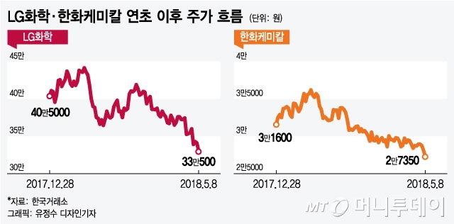 8일 증시에서LG화학(355,000원 ▲10,500 +3.05%)은 전 거래일보다 3.08%(1만500원) 내린 33만500원에 마감했다.한화케미칼(40,050원 ▼250 -0.62%)은 2.67%,금호석유(131,000원 ▲1,100 +0.85%)는 2.76% 내리며 화학업종이 동반 하락했다.