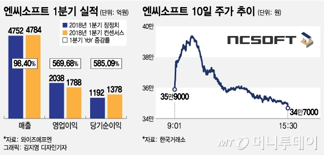 엔씨소프트가 모바일게임 리니지M 흥행 효과에 1분기 어닝서프라이즈(깜짝실적)를 달성했는데도 정작 주가는 하락했다. 기대작 '블레이드&소울2' 출시일이 당초 예상보다 미뤄져 실망감이 반영된 것으로 풀이된다.