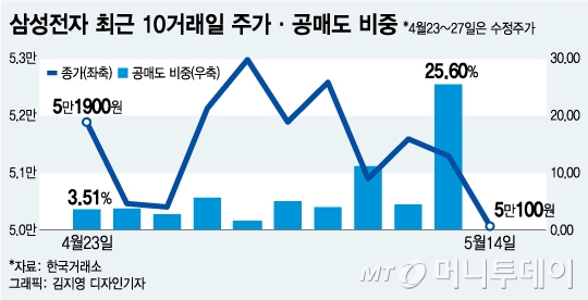 송명섭 하이투자증권 연구원은 "최근 삼성전자 주가 약세는 거래 정지 기간 반영되지 못했던 글로벌 IT주들의 주가 하락과 액면분할 전 몰렸던 매수세가 매도로 돌아서면서 나타나는 것"이라고 설명했다.